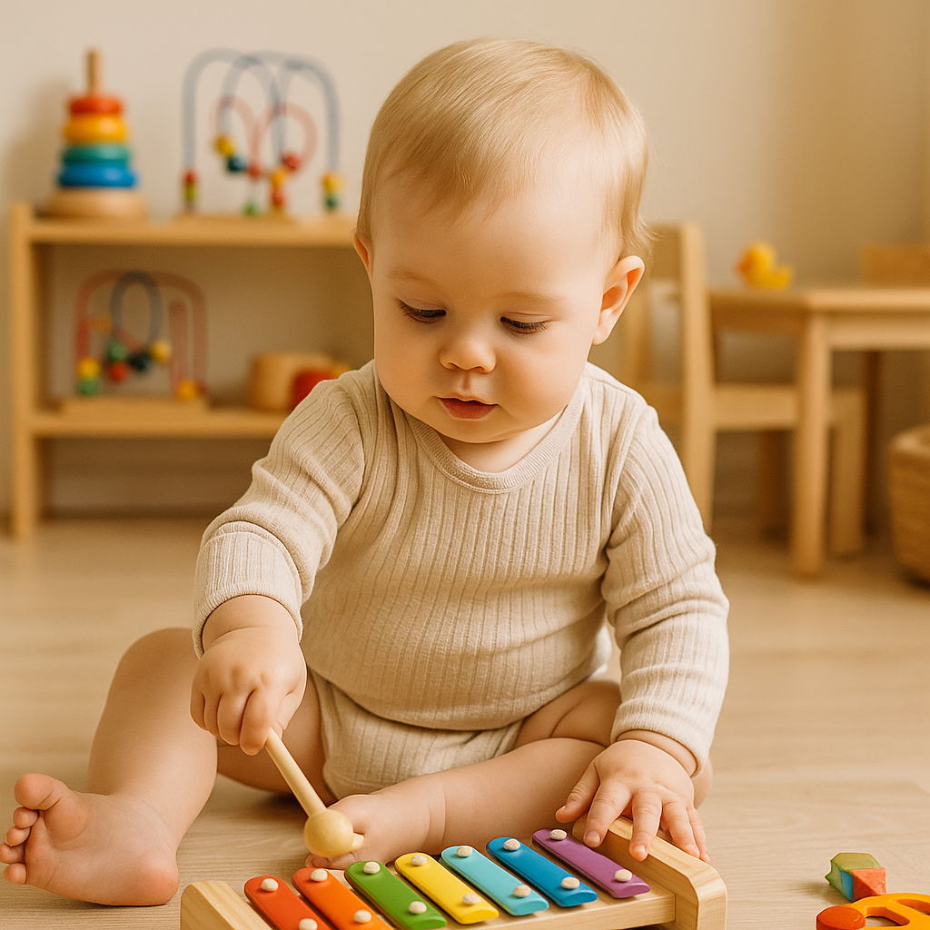 À travers les sons, les textures, la lumière, le mouvement ou encore les instruments simples, l’enfant développe :